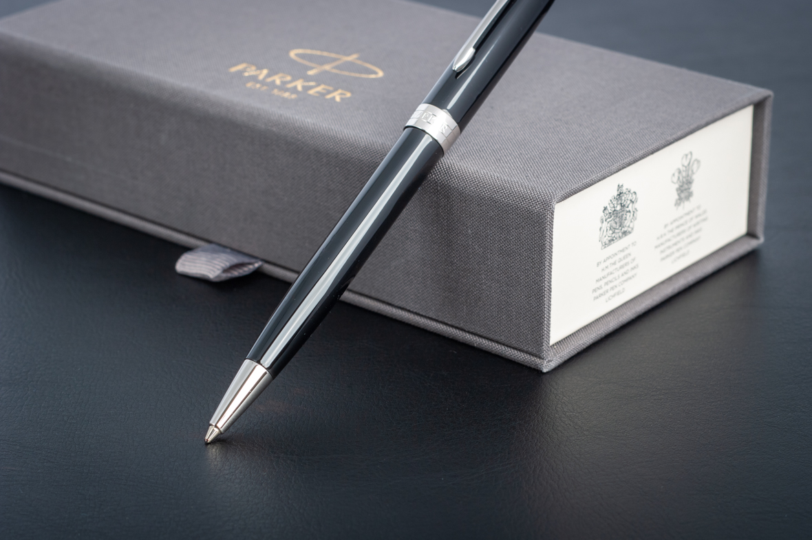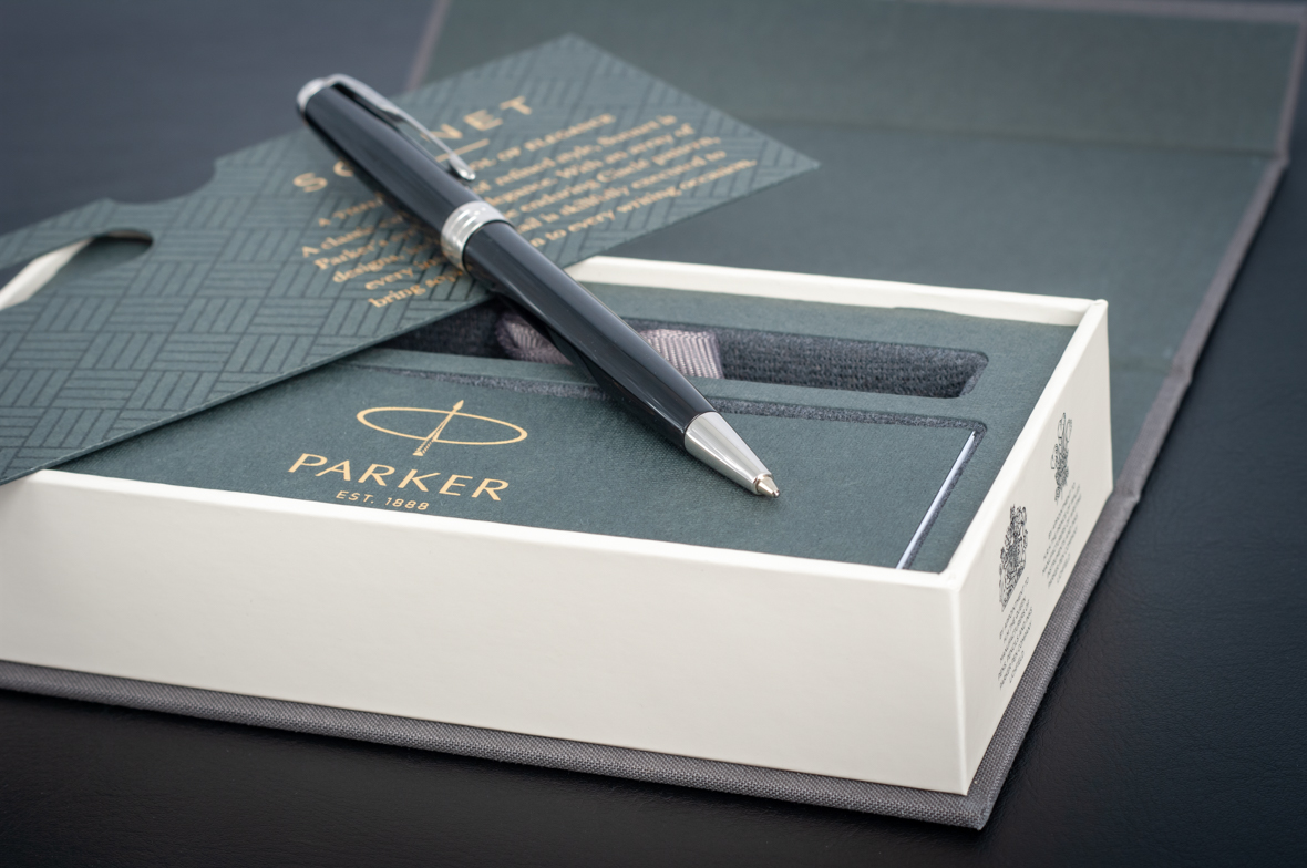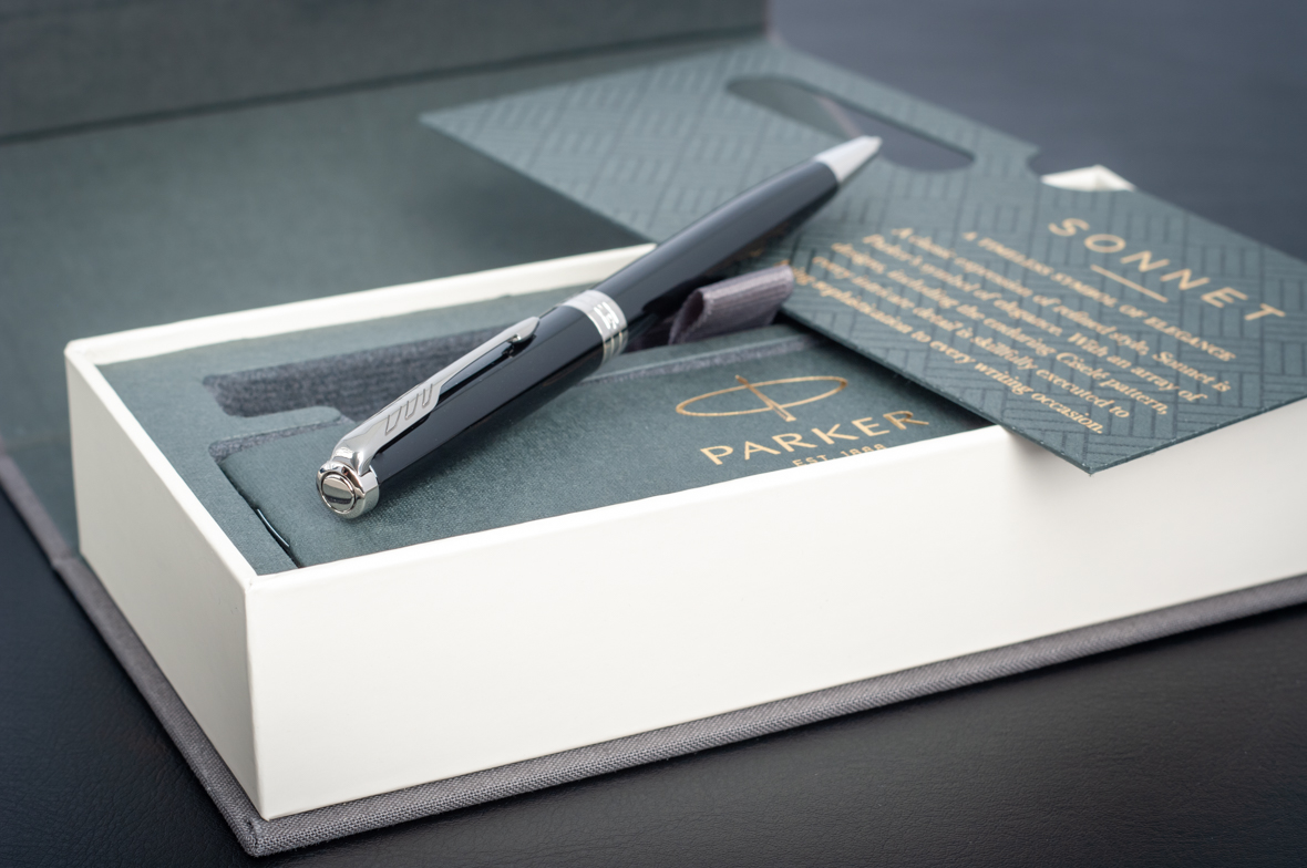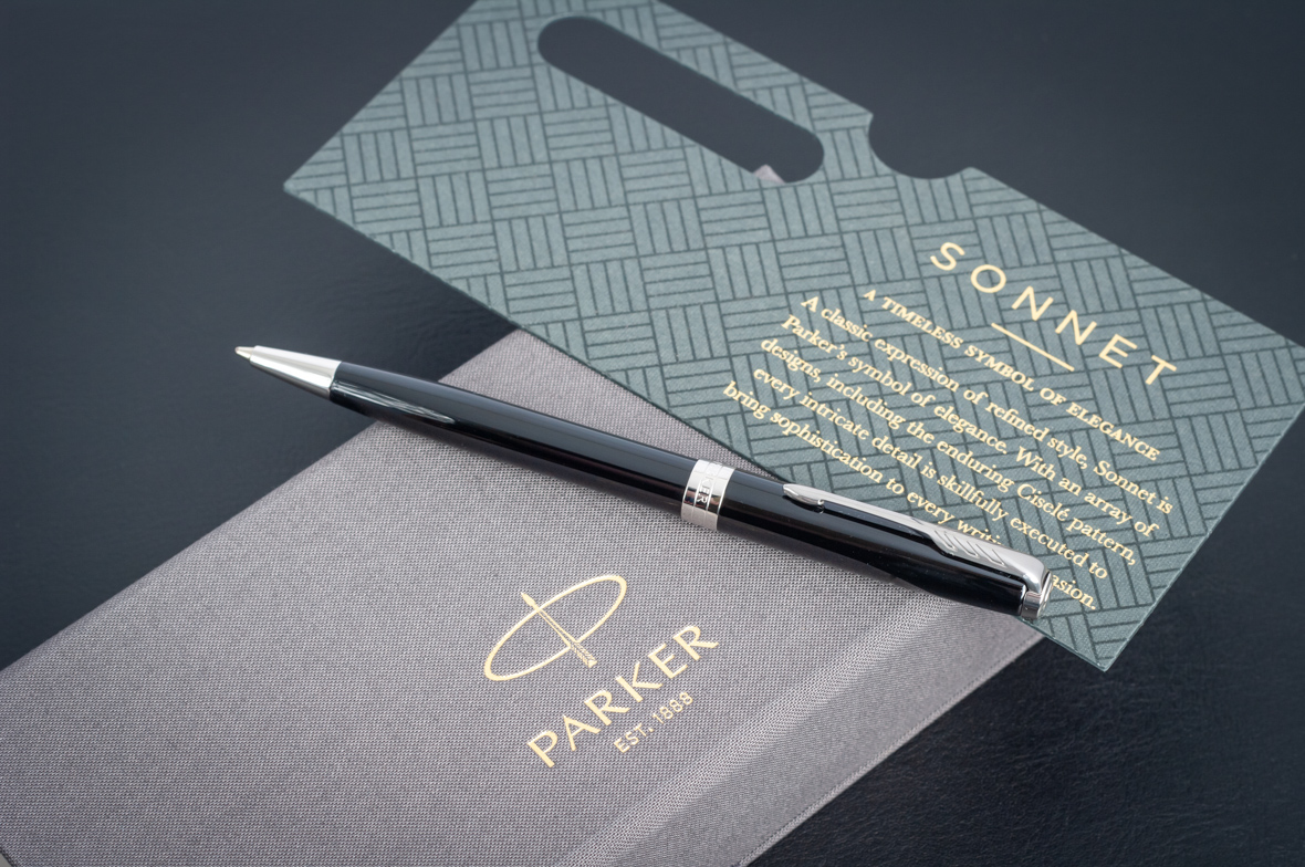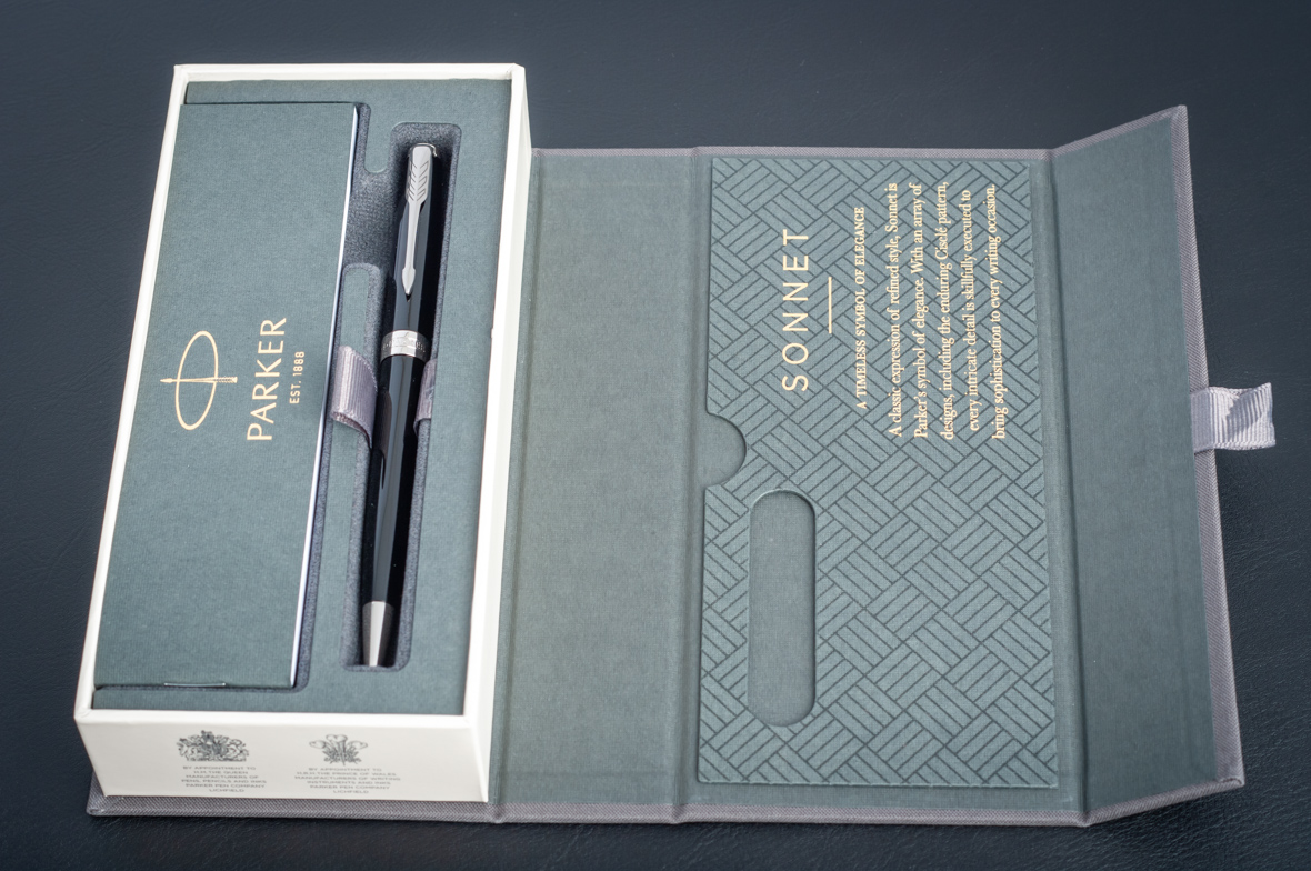 Ручка из основного ассортимента полностью обновленной коллекции Sonnet: более современный дизайн зажима на колпачке (теперь три широких пера вместо пяти узких в предшествующем варианте), измененный торец на колпачке, широкое кольцо на колпачке теперь состоит из 3 соединенных вместе колец, на среднем выполнена гравировка логотипа PARKER. Корпус шариковой ручки выполнен из ювелирной латуни и покрыт черным глянцевым лаком, а детали дизайна покрыты палладием. Ручка поставляется в новой подарочной коробке, которая соответствует основным принципам премиальной упаковки. На боковой стороне коробки нарисованы гербы - подтверждение гарантии Британского Королевского двора.